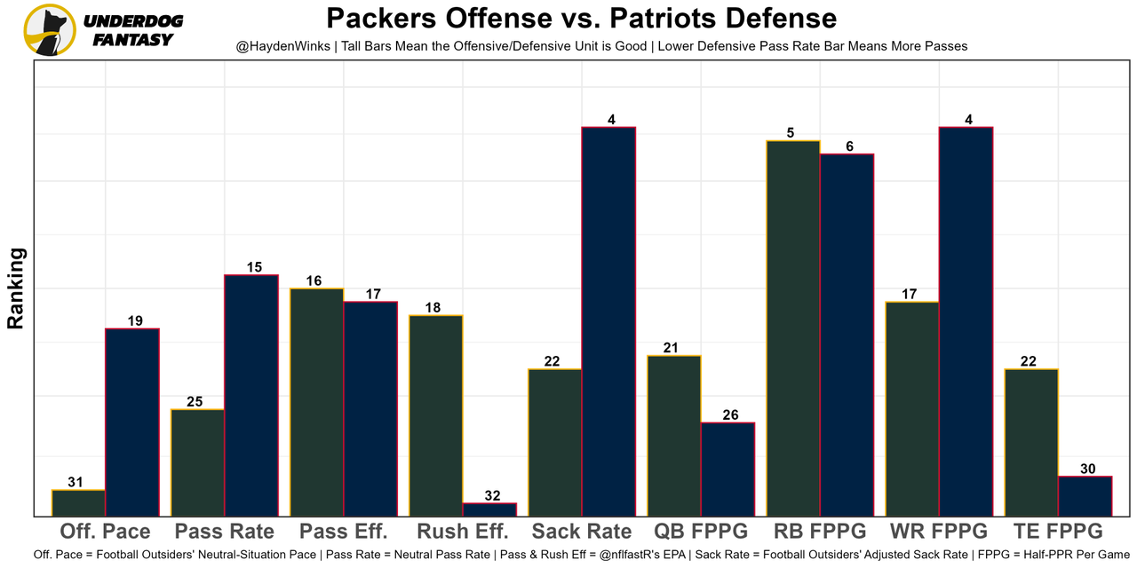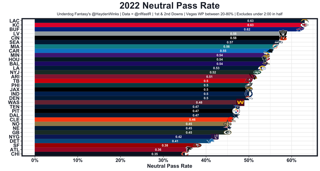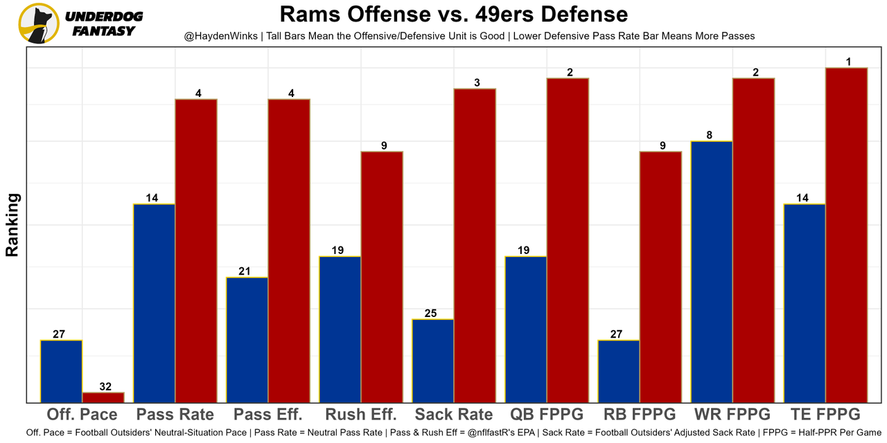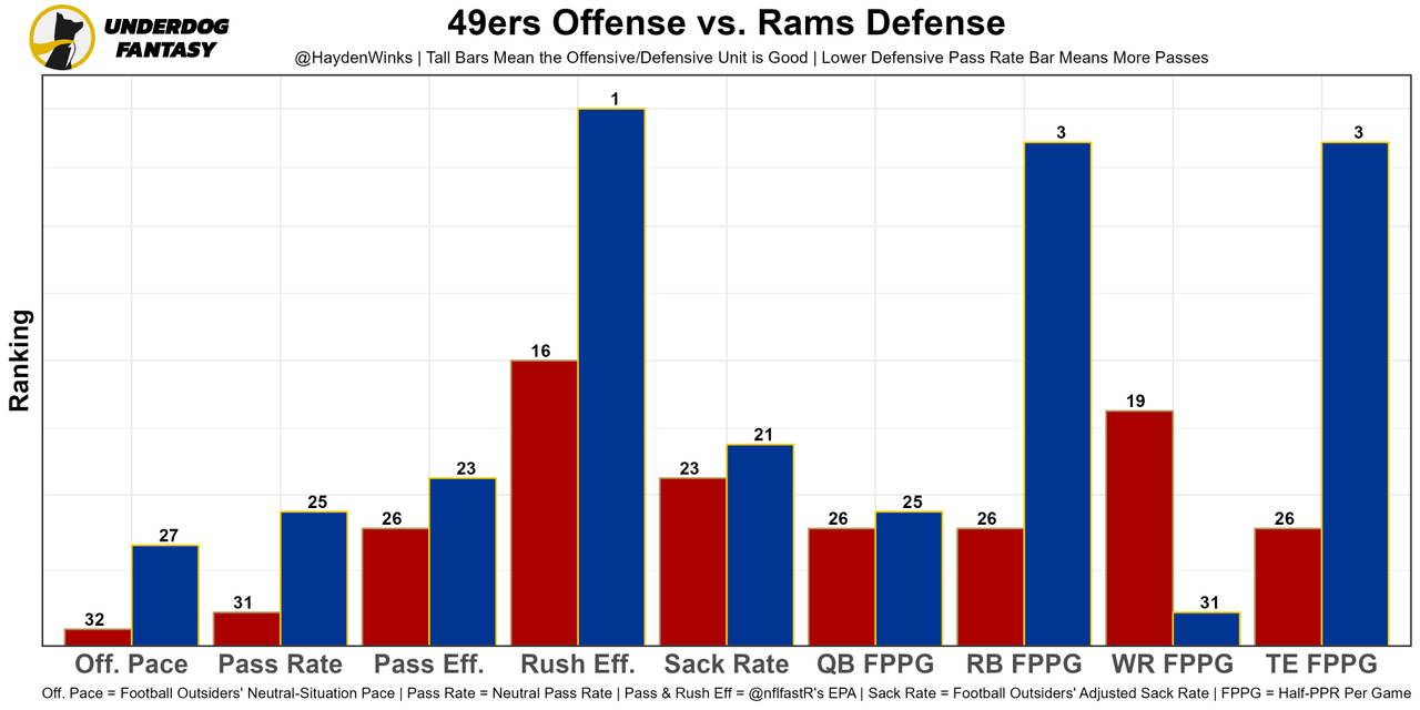 The best offensive lineman in the NFL by a wide margin, losing LT Trent Williams can't be overstated. His backup was benched 7 snaps in after missing at least 3 blocks, and the rest of the OL was already well below-average. Jimmy G will have to stay poised under pressure to have success, especially with Aaron Donald in town. As usual, the Niners are 32nd in neutral pace and 31st in neutral pass rate.