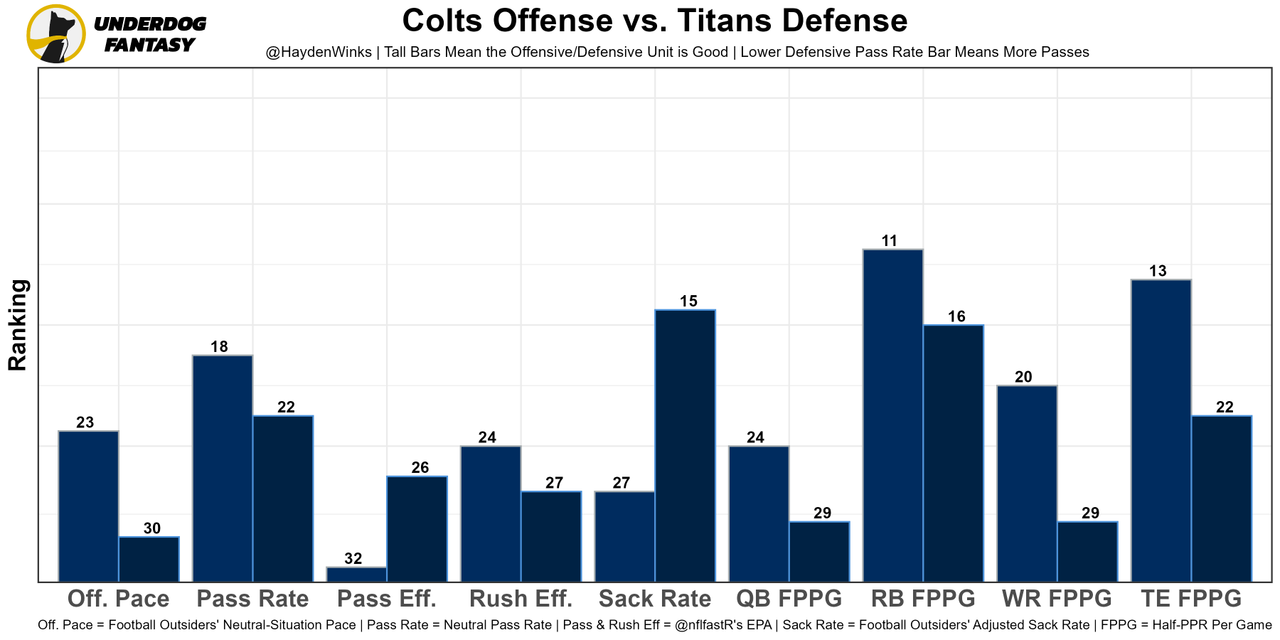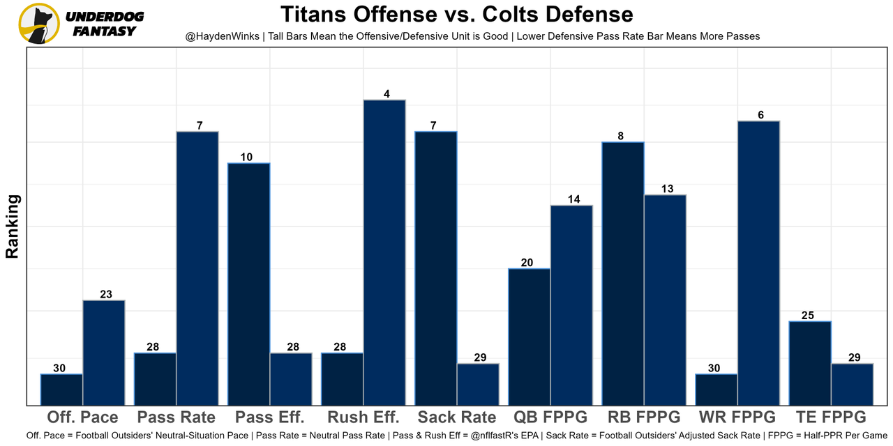 30th in neutral pace and 28th in neutral pass rate is an impossible task to overcome. The Colts also play slow and held up well against the damn Chiefs last week. The Titans remain without LT Taylor Lewan, who is out for the year and probably their best lineman in general.