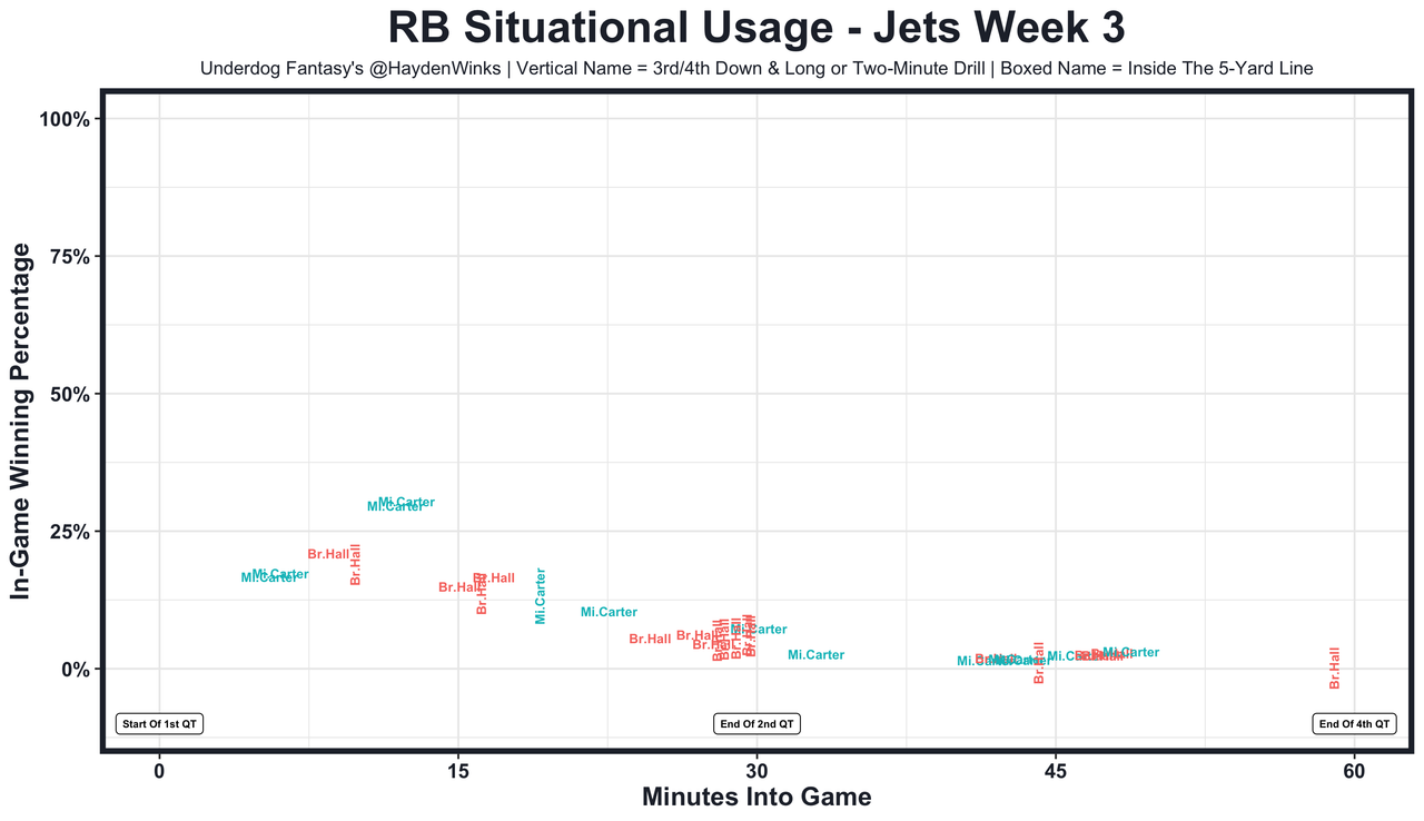 Breece Hall - He's playing more snaps because he regained the 2-minute drill role, but Hall is still behind Carter in the 2-back rotation in general. Fewer passes to RBs are expected with backyard QB Zach Wilson back instead of checkdown king Joe Flacco.
