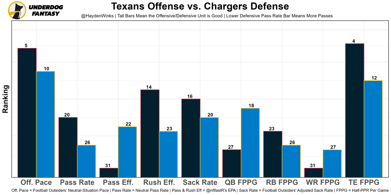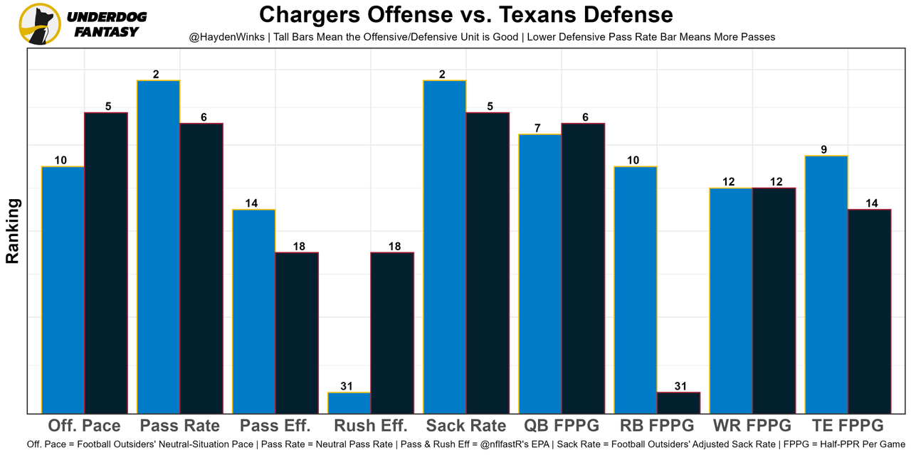 All Pro caliber LT Ra'Shawn Slater (biceps) is out for the year, and his backup was PFF's No. 85 OT out of 87 qualifiers last week. We talked about the Chargers offense here, but in short, expect even more quick game and worse efficiency in general. They also lost their primary speed threat (Jalen Guyton) for the season. This team could finish would be bottom-5 in a skill position relay race. Herbert, it's all on you now. At least the Texans are up next.