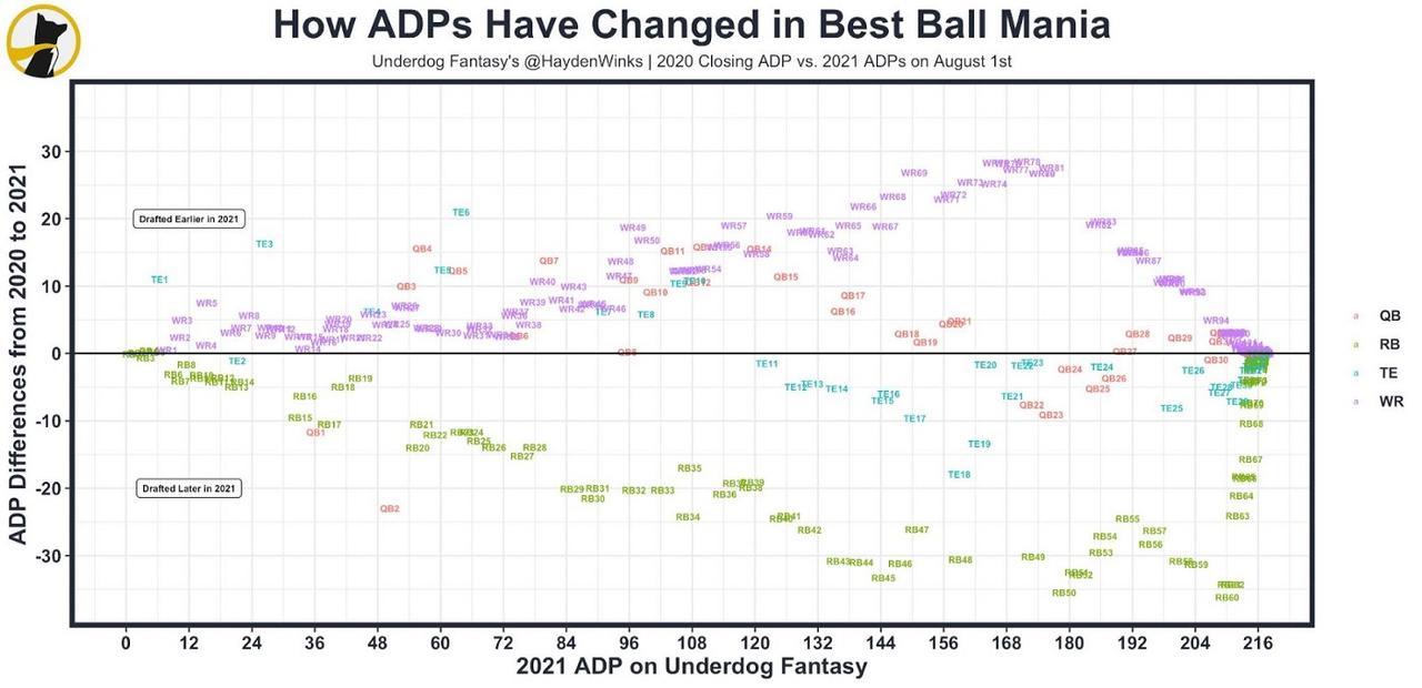 What’s changed from Best Ball Mania I to Best Ball Mania II is prices. And this can’t go overlooked. Patrick Mahomes is a round cheaper, as is the QB2, but the QB3 to QB15 are all being drafted about one round earlier this year compared to 2020. A lot of this is justified after seeing the dual-threat QBs really take off last year, but this does mean that other strategies deserve some attention now that things are more priced in.