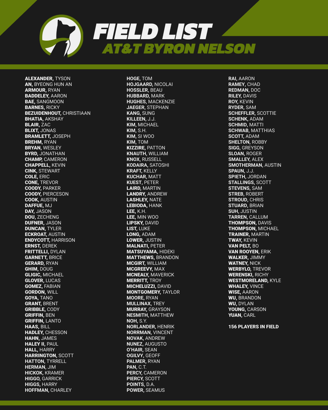 This column will provide any field updates, injury news, and other player notes in the days leading up to the AT&T Byron Nelson.