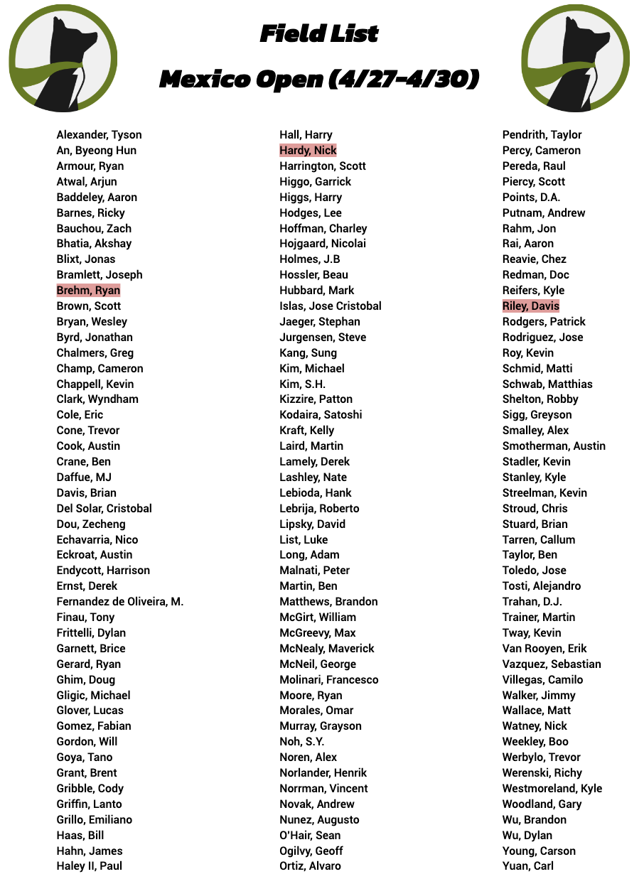 Sponsor Exemptions: Cristobal Del Solar, Mateo Fernandez de Oliveira, Jose Cristobal Islas, Richard Johnson, Roberto Lebrija, Omar Mrales, Alvaro Ortiz, Raul Pereda, Jose de Jesus Rodriguez, Alejandro Tosti, Sebastian Vazquez, Boo Weekley