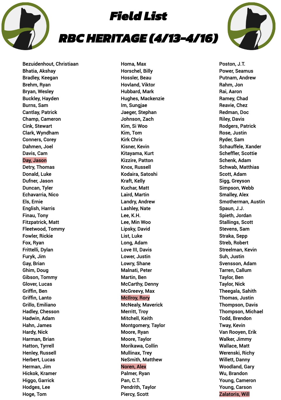 Field Changes (-): Jason Day, Rory McIlroy, Alex Noren, and Will Zalatoris are all out.