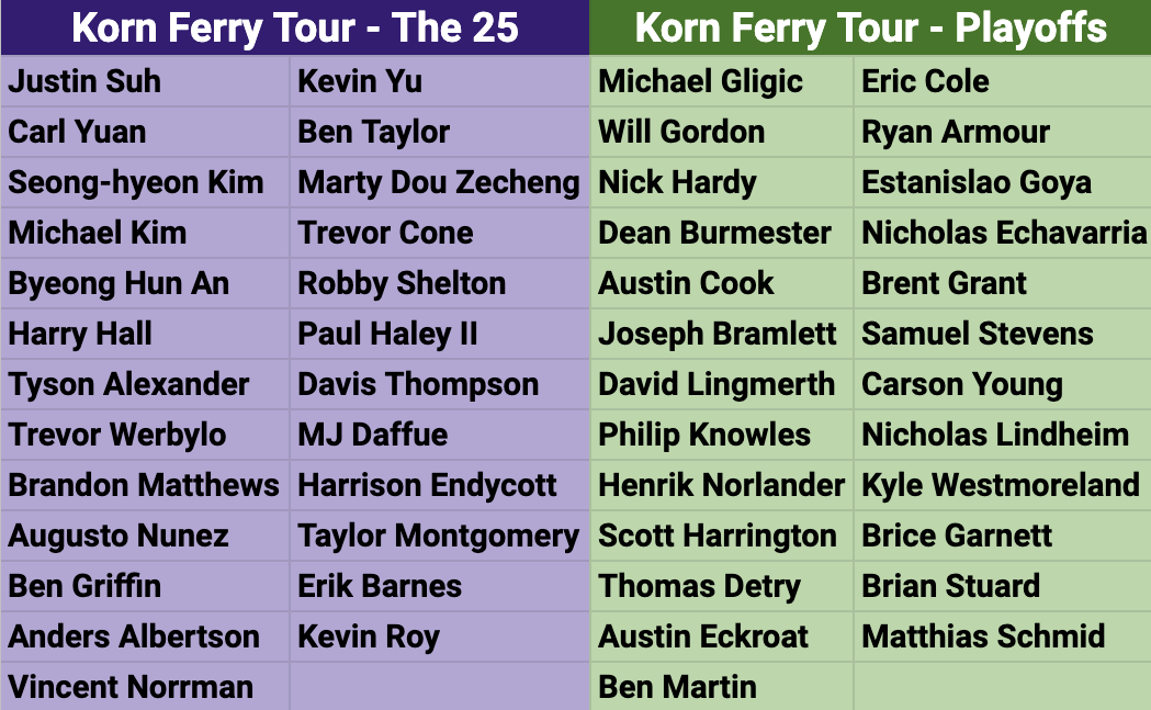 25 additional PGA Tour cards were awarded through the Korn Ferry Tour Finals–essentially the KFT’s playoff events. All of these names are listed below: