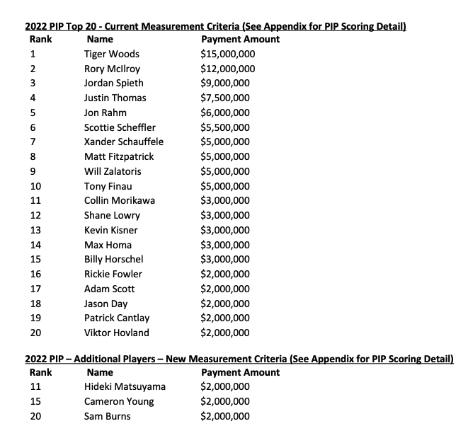 The 2022 version of the PIP doubled in both the amount of money awarded ($50 million to $100 million) and number of golfers included (10 to 20).