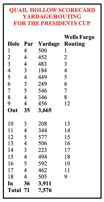 “In the previous 13 Presidents Cups, totaling 422 matches, one team or individual closed out the opponent before the 17th hole almost 40 percent of the time. If no alterations were made, many matches would not reach two of Quail Hollow’s most entertaining, throat-clutching cornerstones, the 190-yard par-3 17th playing entirely across water and the 494-yard 18th, regularly one of the hardest par 4s on tour.”