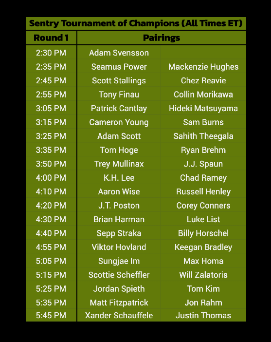33% of the field is making their first appearance at the Sentry Tournament of Champions: Ryan Brehm, Matt Fitzpatrick, Tom Hoge, Luke List, Trey Mullinax, Chad Ramey, J.J. Spaun, Sepp Straka, Adam Svensson, Sahith Theegala, Cameron Young, and Will Zalatoris.