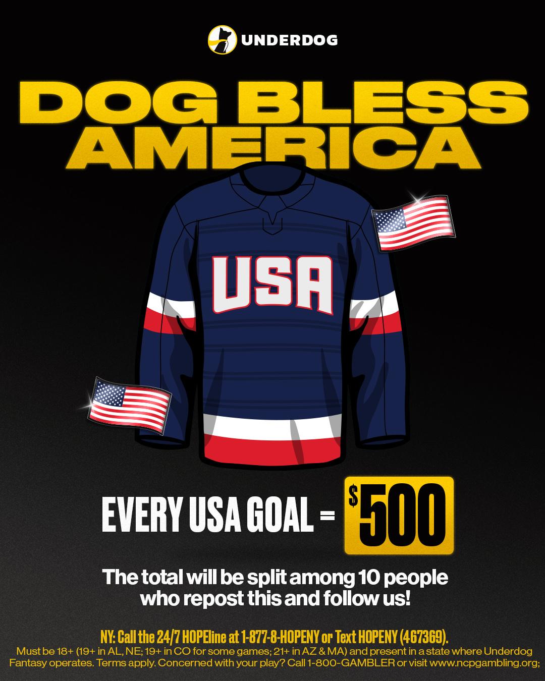 On Thursday, February 20, 2025 beginning at 12:00:00 PM ET and ending at 11:59:00 PM ET (the “Promotion Period”), Underdog Sports, LLC (“Sponsor”) will host a giveaway. Follow these 2 steps during the Promotion Period for your chance to win: (1) follow Underdog Fantasy at @UnderdogFantasy on Twitter/X; and (2) repost the Tweet. The amount of Underdog promotional credit given away will be determined by the amount of goals scored by the United States Men’s Hockey Team on Thursday, February 20th, 2025 ($500 per goal). Ten (“10”) winners will be selected at random and will receive an equal split of Underdog Fantasy promotional credit deposited to their Underdog account.